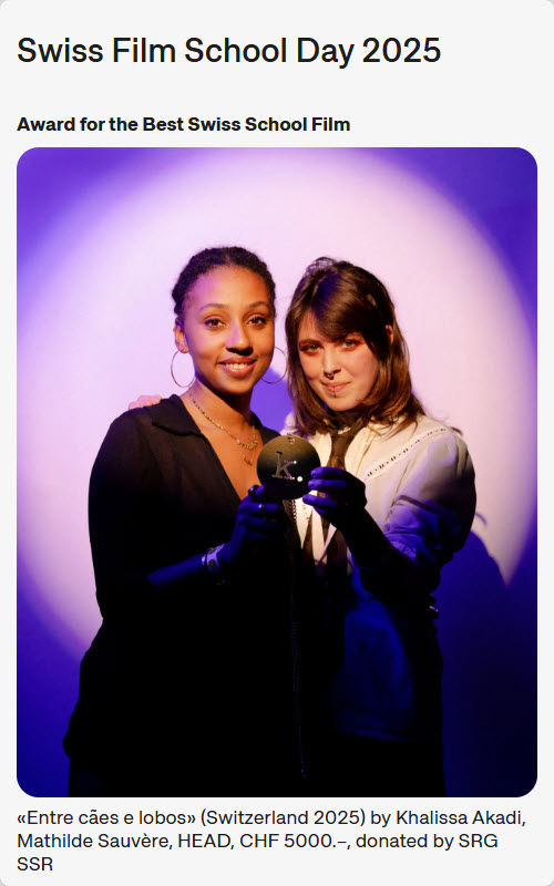 The jury of the Swiss competition conducts a Q&A with the students, offers insights from the industry, and awards the prize for the Best Swiss School Film (CHF 5000.–, donated by SRG SSR). The winner will be announced at the Industry Awards Ceremony on Saturday 8/11 at 18:30 at Museum Schaffen.